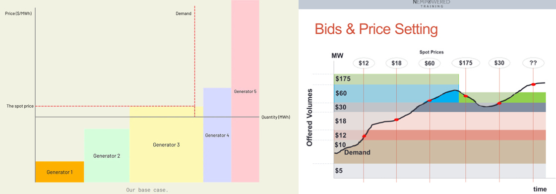 Generators submit bids for how much they will supply and at what price. These bids are stacked from lowest to highest cost.